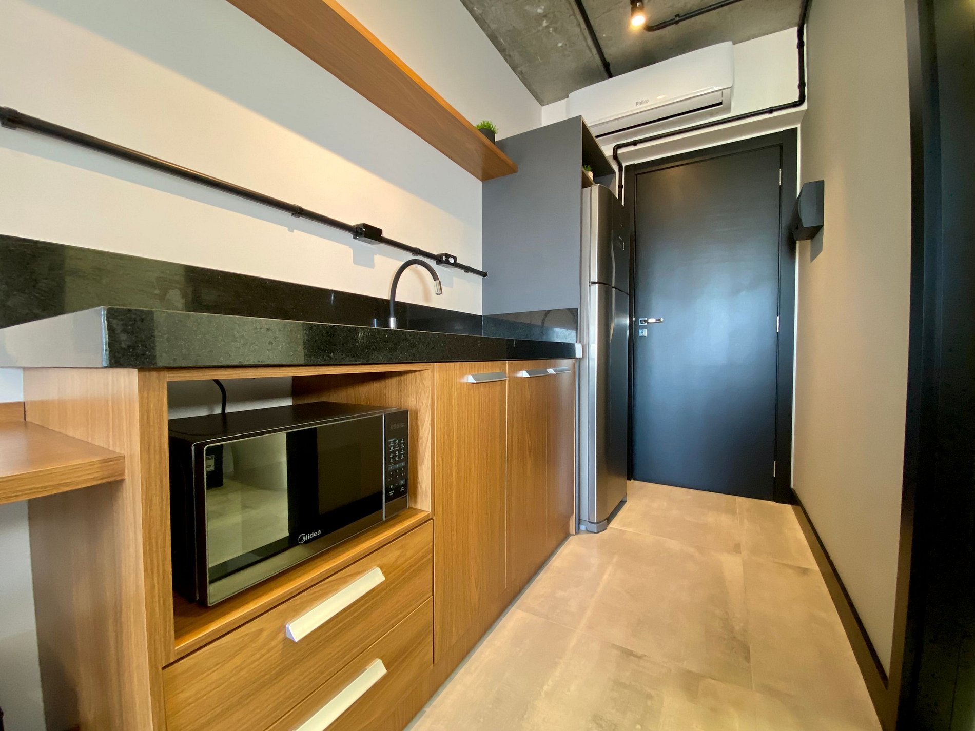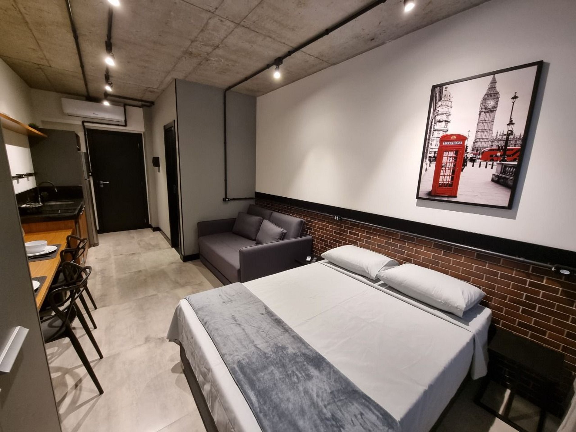 Studio compacto, equipado com todas as facilidades para uma estadia confortável. Conta com utensílios e eletrodomésticos que garantem praticidade no dia a dia.