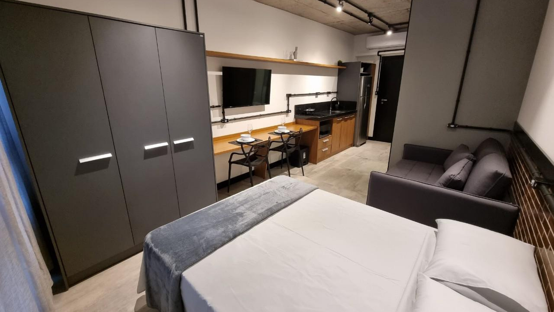Studio compacto, equipado com todas as facilidades para uma estadia confortável. Conta com utensílios e eletrodomésticos que garantem praticidade no dia a dia.